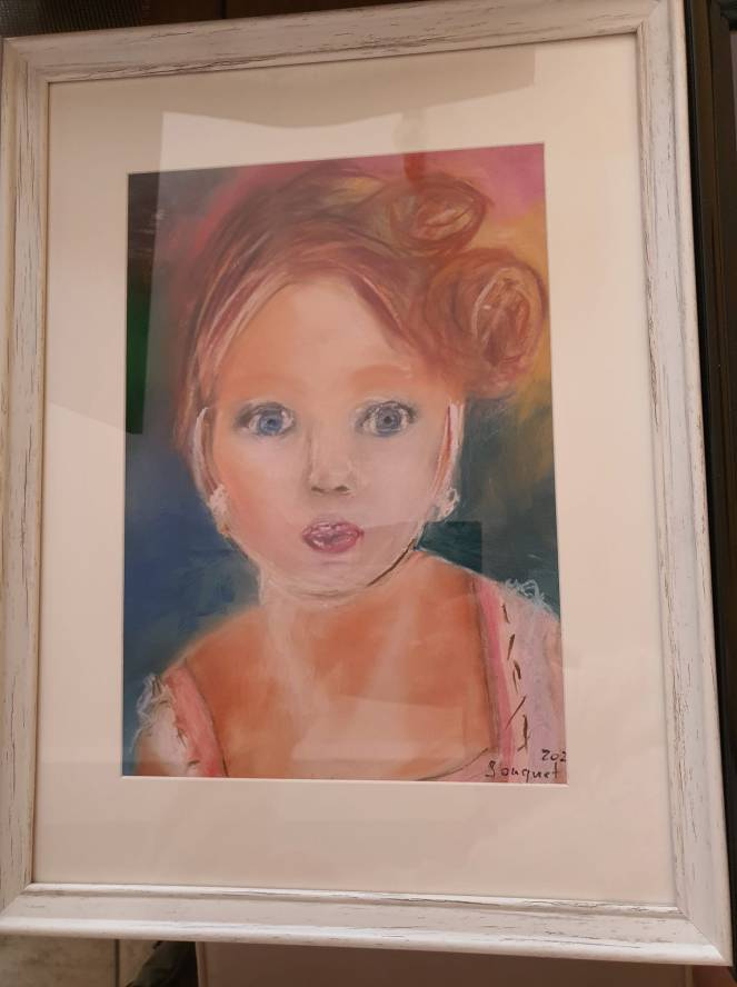J’adoré ce que j’ai produis et le résultat final. J’ai beaucoup pratiqué l’estompage et le jeu de lumière. Les cheveux roux sont arrivés par hasard car j’ai fais cela avec des pastels que j’avais sous la main (et bah tant mieux !). Je trouve les teintes en harmonie et les couleurs lumineuses. Non franchement je ne suis pas déçue (pour une fois !). Pour cette petite roussette je suis partie d’une photo portrait et n’arrivant pas à la reproduire, je suis partie en live… (hé bé !). J’ai commencé n’importe quoi en gardant les bases du portrait. Plus j’avançais dans ma création plus je la trouvais jolie, alors j’ai poussé les traits comme une grande en reculant et m’approchant de la peinture comme une pro. (bon là, je me félicite et ca fait du bien !).