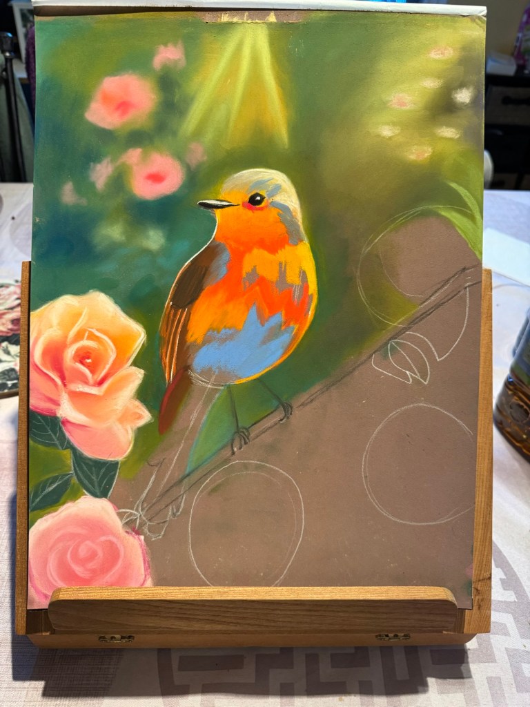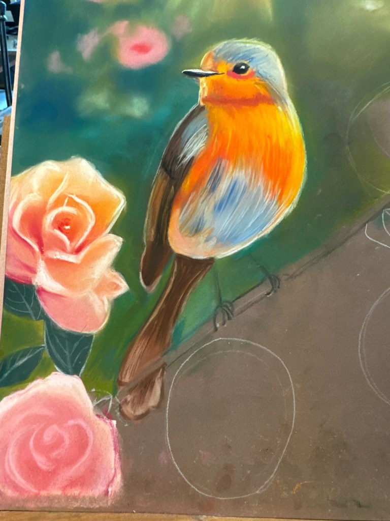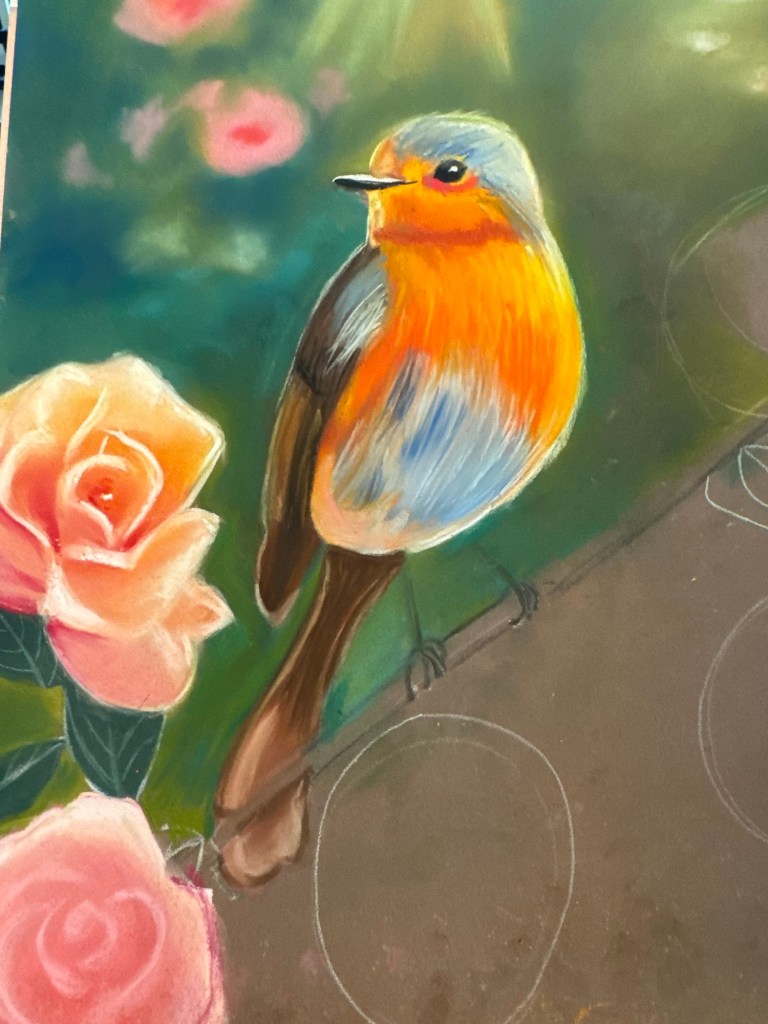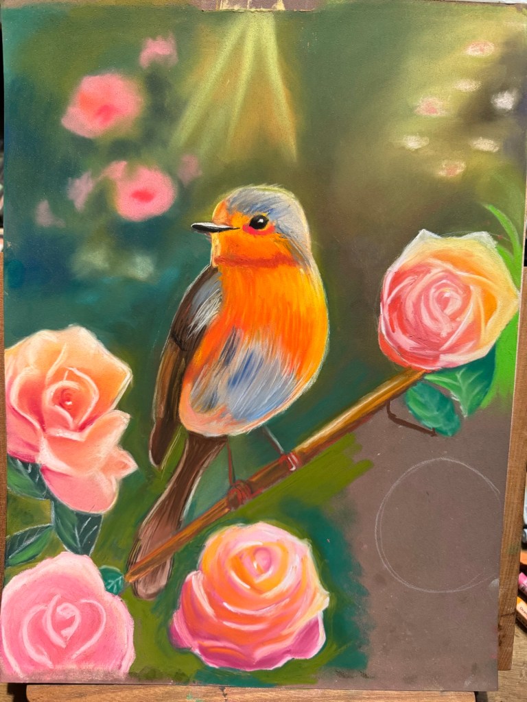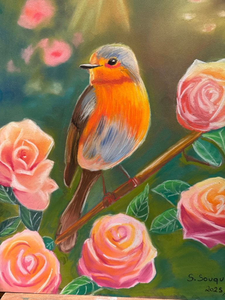 L’image présente une peinture d’un oiseau posé sur une branche entourée de roses. L’oiseau, un rouge-gorge, a des plumes orange sur sa poitrine et des nuances de gris sur sa tête et ses ailes. Les roses autour de lui sont dans des tons de rose et de pêche, avec des feuilles vertes. L’arrière-plan est flou, avec des touches de lumière douce qui créent une ambiance chaleureuse et sereine.