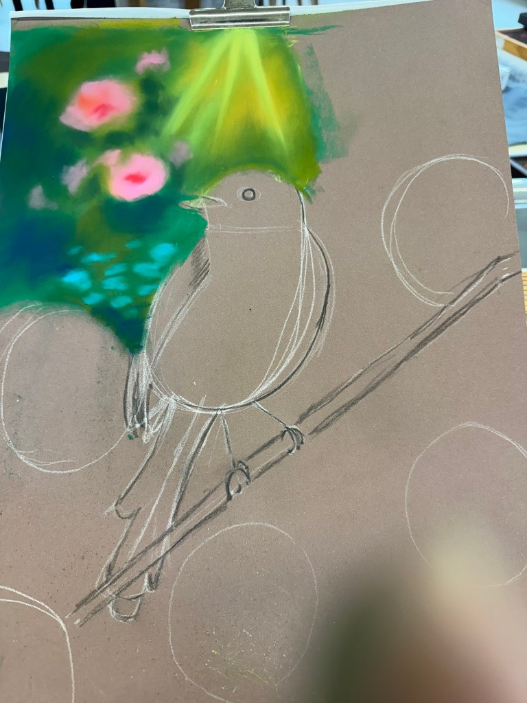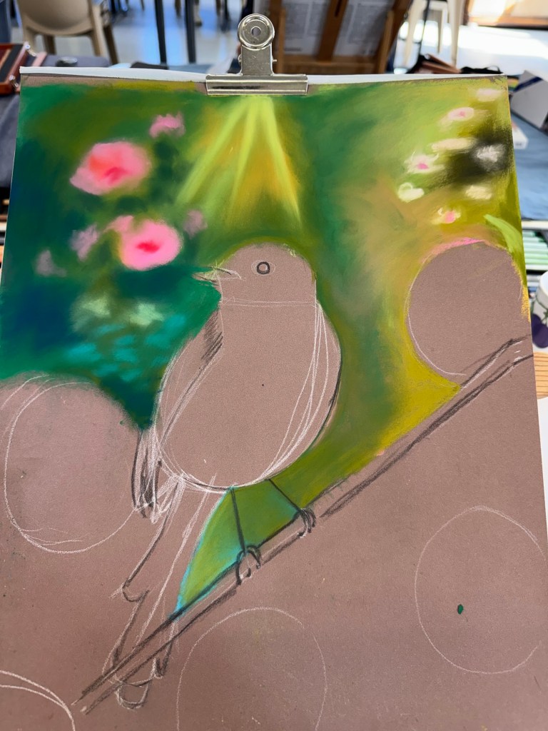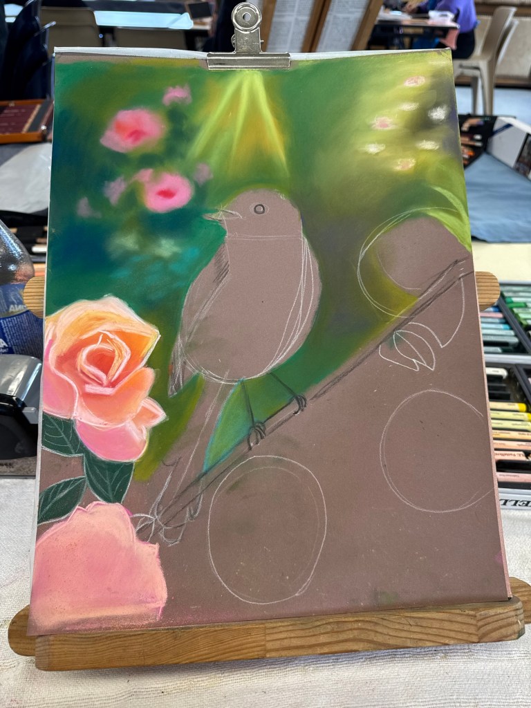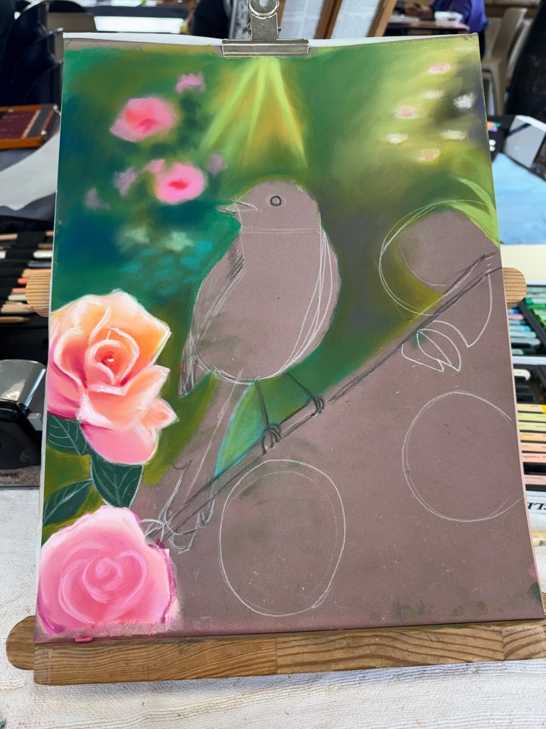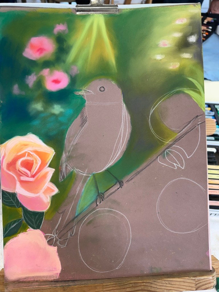 L’image présente une peinture d’un oiseau posé sur une branche entourée de roses. L’oiseau, un rouge-gorge, a des plumes orange sur sa poitrine et des nuances de gris sur sa tête et ses ailes. Les roses autour de lui sont dans des tons de rose et de pêche, avec des feuilles vertes. L’arrière-plan est flou, avec des touches de lumière douce qui créent une ambiance chaleureuse et sereine.