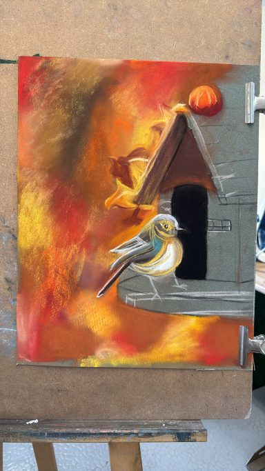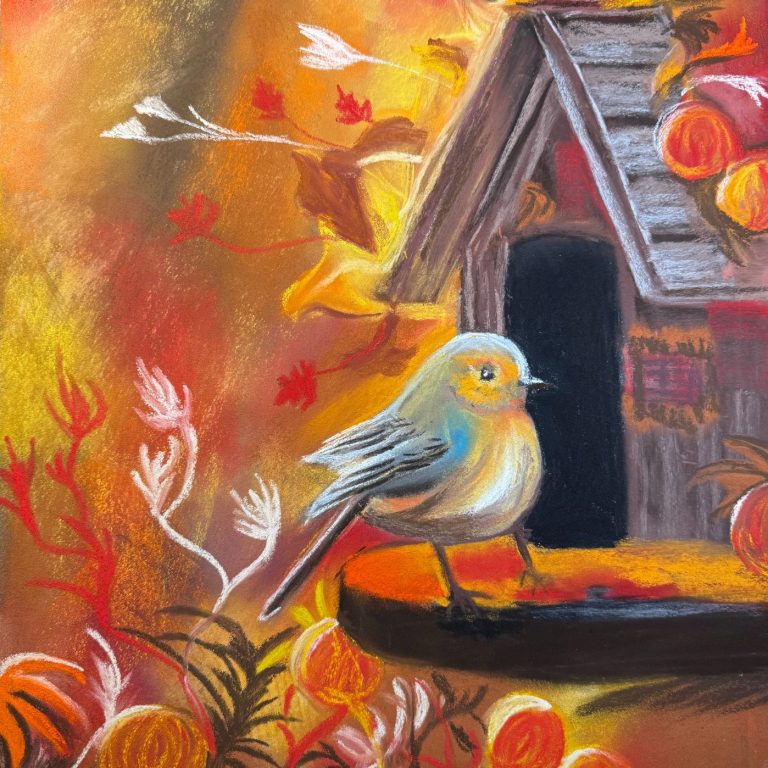 Au centre de la composition, un petit oiseau, véritable point focal, semble avoir trouvé un havre de paix. Posé avec une délicatesse qui contraste avec l'énergie du fond, il incarne la vie qui persiste et s'adapte au rythme des saisons. Juste derrière lui, une petite cabane rustique, nichée parmi les feuillages aux teintes brûlées, renforce cette impression de cocon protecteur contre la fraîcheur qui s'installe.