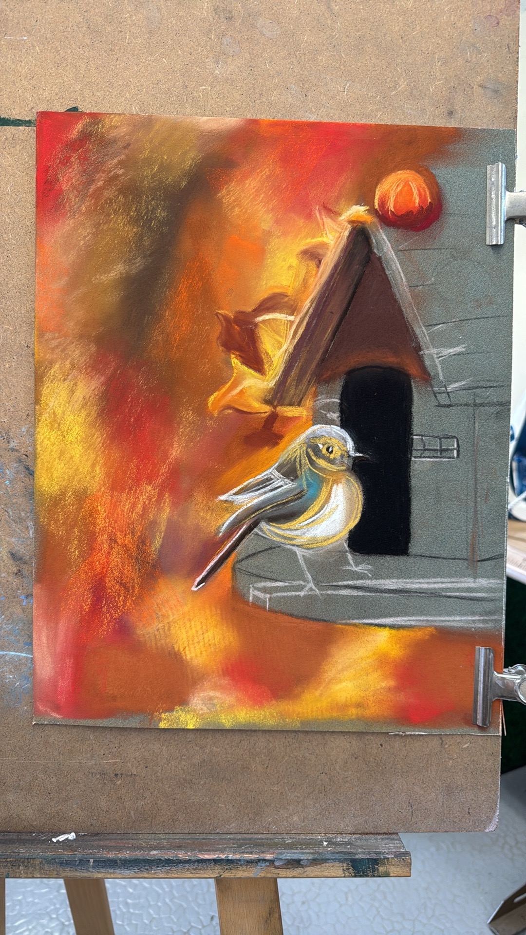 Dans une symphonie de tons chauds et vibrants, cette œuvre nous transporte instantanément au cœur de l’automne. À travers l'utilisation expressive du pastel, l’artiste a su capturer l’essence même de cette saison de transition, où la nature se pare de ses plus beaux atours avant le repos hivernal.