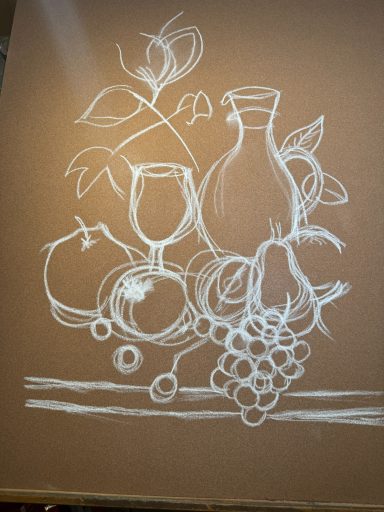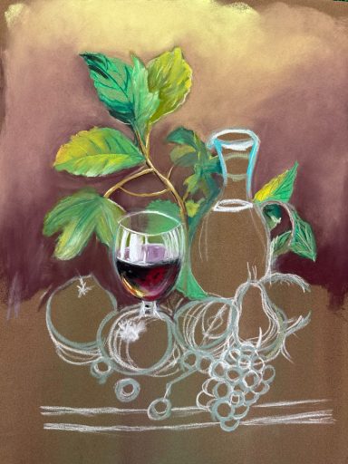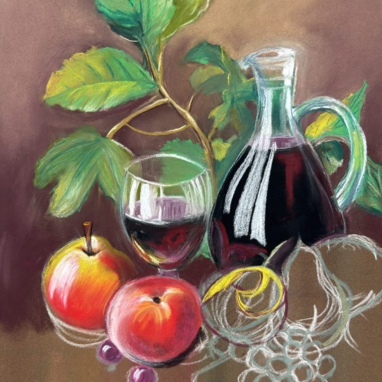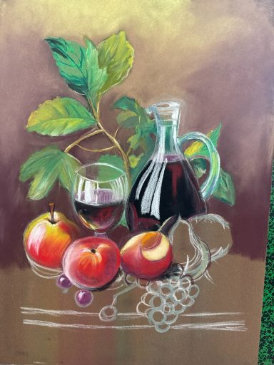 Il est des instants où le temps semble s'immobiliser, suspendu au bout d'une craie de pastel. Dans cette œuvre lumineuse, la table de bois brut devient le théâtre d’une rencontre sensorielle entre la vigne et le verger. C’est une célébration de la gourmandise rustique, un hommage aux plaisirs simples de la terre.