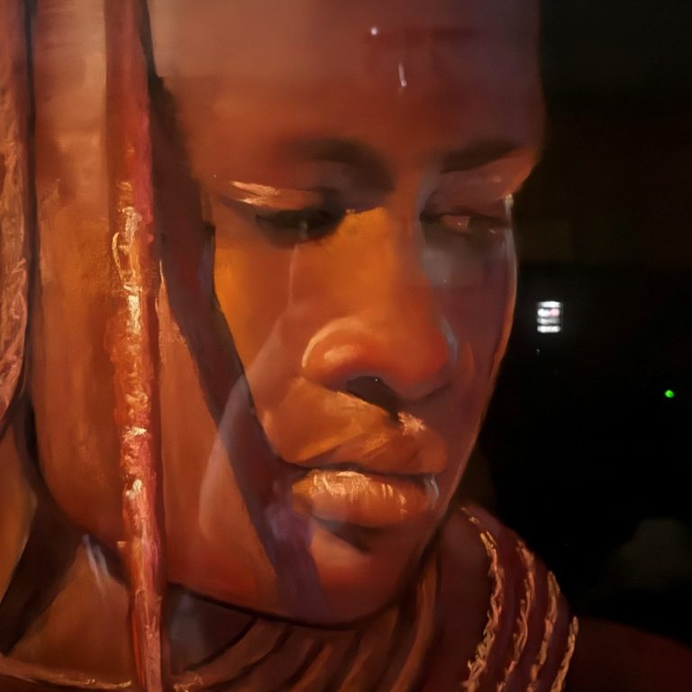 Dans l'obscurité d'un cadre qui semble à peine pouvoir contenir son sujet, un visage s'illumine. Ce portrait, d'une intensité rare, nous plonge au cœur d'une esthétique où la matière et la lumière ne font qu'un. Plus qu'une simple représentation humaine, c'est une célébration de l'identité et de la résilience.